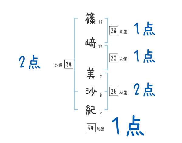 天運![]() | 篠﨑美沙紀さんの天運は28画の1つ星!家庭環境に注意。スポーツで活躍できる能力があるかも。 家系が持つ宿命的な運勢を表します。祖先から受け継いだ苗字ですので自分の力が及びません。家柄を象徴します。 |
