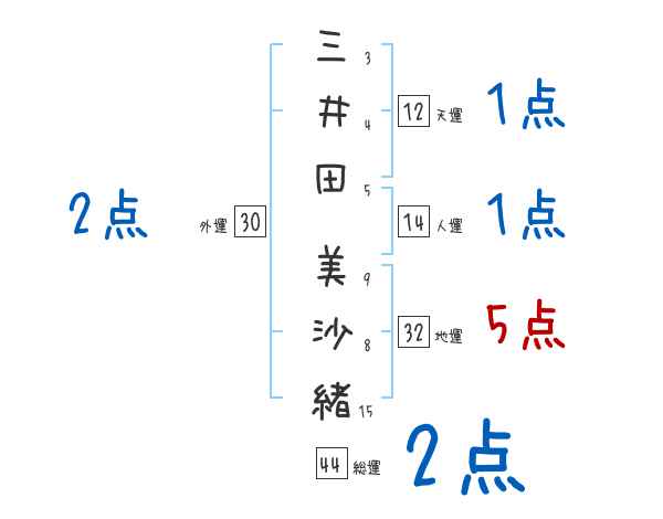 地運![]() | 三井田美沙緒さんの地運は32画の5つ星!柔軟性があり成功する。チャンスが多く金運が良い。 個性を表す基礎的な運勢です。性格形成や対人関係、行動力など家庭環境に影響されます。主に誕生してから20歳くらいまでの若年期の運勢を表します。 |