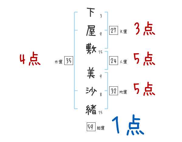 天運![]() | 下屋敷美沙緒さんの天運は27画の3つ星!頭脳明晰だが強情で摩擦が多い傾向。孤立に注意。 家系が持つ宿命的な運勢を表します。祖先から受け継いだ苗字ですので自分の力が及びません。家柄を象徴します。 |