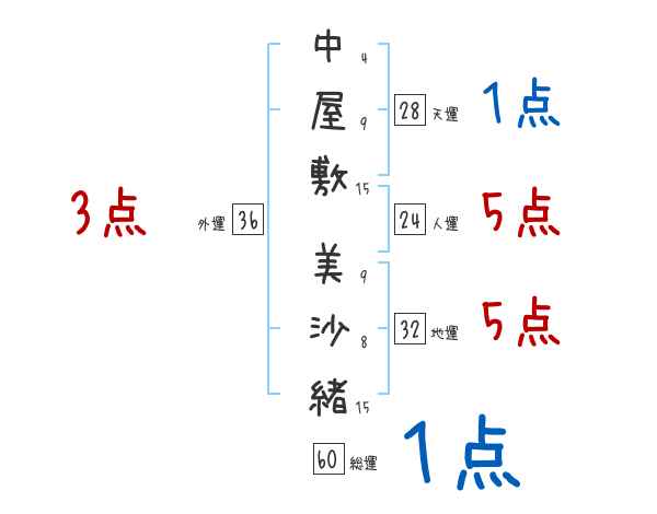 外運![]() | 中屋敷美沙緒さんの外運は36画の3つ星!先見性が豊かです。多少神経質で苦労することも。 生活面を象徴する運勢です。外部から受ける影響力を表し、結婚運、家庭運や職場、環境への順応性を表します。 |