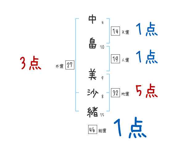 外運![]() | 中畠美沙緒さんの外運は27画の3つ星!頭脳明晰だが強情で摩擦が多い傾向。孤立に注意。 生活面を象徴する運勢です。外部から受ける影響力を表し、結婚運、家庭運や職場、環境への順応性を表します。 |