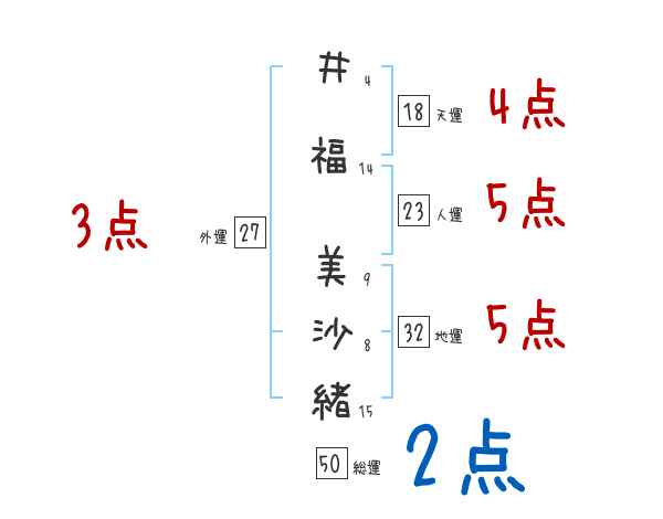 総運![]() | 井福美沙緒さんの総運は50画の2つ星!浮き沈みが激しく不安定。しりすぼみに衰退しやすいので注意しましょう。 あなたの人生を表す1番重要な運勢です。生涯を通じて影響する総合運となり、主に50歳以降の晩年期に影響を及ぼします。 |