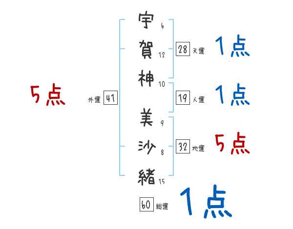 天運![]() | 宇賀神美沙緒さんの天運は28画の1つ星!家庭環境に注意。スポーツで活躍できる能力があるかも。 家系が持つ宿命的な運勢を表します。祖先から受け継いだ苗字ですので自分の力が及びません。家柄を象徴します。 |