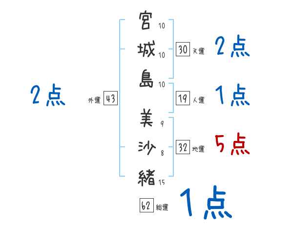天運![]() | 宮城島美沙緒さんの天運は30画の2つ星!浮き沈みの激しさに注意しましょう。 家系が持つ宿命的な運勢を表します。祖先から受け継いだ苗字ですので自分の力が及びません。家柄を象徴します。 |