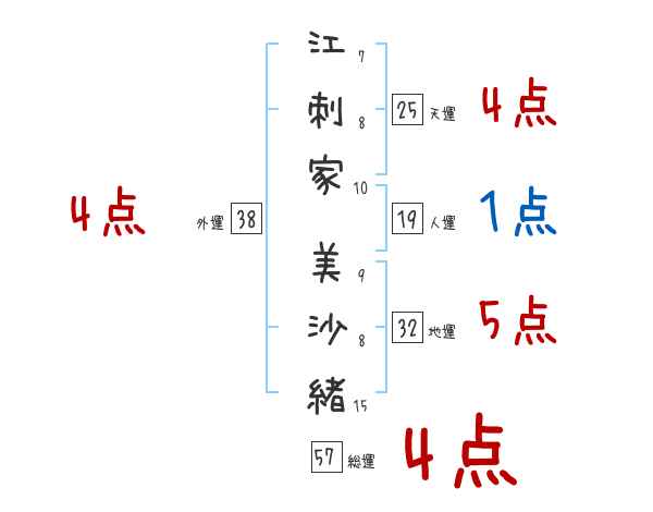 天運![]() | 江刺家美沙緒さんの天運は25画の4つ星!個性があり才能があふれる。強運の持ち主で発展する。 家系が持つ宿命的な運勢を表します。祖先から受け継いだ苗字ですので自分の力が及びません。家柄を象徴します。 |