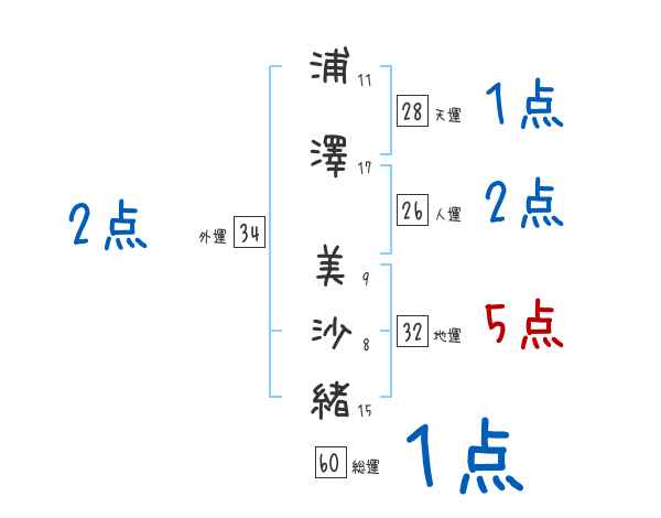 人運![]() | 浦澤美沙緒さんの人運は26画の2つ星!波瀾万丈かも。信頼できる人を大事にしましょう。 性格や才能などを表す2番目に重要な運勢です。人間関係や協調性、社会的な成功に影響します。主に20歳から50歳ぐらいまでの中年期の運勢を表します。 |