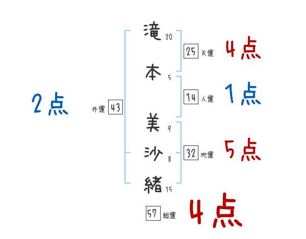 外運![]() | 滝本美沙緒さんの外運は43画の2つ星!頑固な性格で独立心が強いかも。やや非現実的で浪費に注意しましょう。 生活面を象徴する運勢です。外部から受ける影響力を表し、結婚運、家庭運や職場、環境への順応性を表します。 |