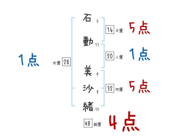 外運![]() | 石動美沙緒さんの外運は28画の1つ星!家庭環境に注意。スポーツで活躍できる能力があるかも。 生活面を象徴する運勢です。外部から受ける影響力を表し、結婚運、家庭運や職場、環境への順応性を表します。 |