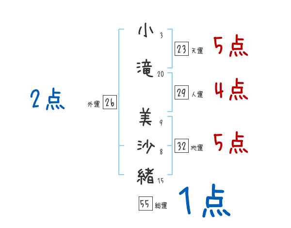 天運![]() | 小滝美沙緒さんの天運は23画の5つ星!想像力に優れ活力がある。一代で成功し名誉を手に入れる。 家系が持つ宿命的な運勢を表します。祖先から受け継いだ苗字ですので自分の力が及びません。家柄を象徴します。 |