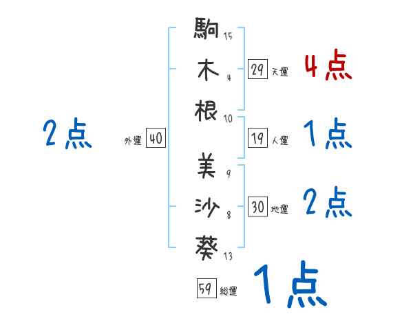 天運![]() | 駒木根美沙葵さんの天運は29画の4つ星!完全主義で才能がある。厳格な心の持ち主。 家系が持つ宿命的な運勢を表します。祖先から受け継いだ苗字ですので自分の力が及びません。家柄を象徴します。 |