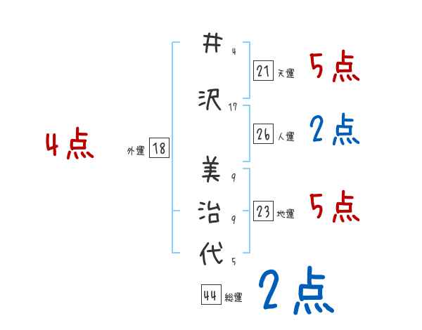 総運![]() | 井沢美治代さんの総運は44画の2つ星!誠実で慎重な性格。物事を考えすぎないように注意しましょう。 あなたの人生を表す1番重要な運勢です。生涯を通じて影響する総合運となり、主に50歳以降の晩年期に影響を及ぼします。 |