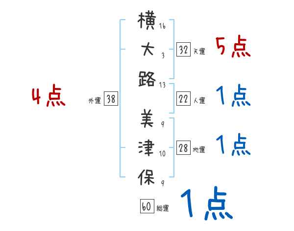 天運![]() | 横大路美津保さんの天運は32画の5つ星!柔軟性があり成功する。チャンスが多く金運が良い。 家系が持つ宿命的な運勢を表します。祖先から受け継いだ苗字ですので自分の力が及びません。家柄を象徴します。 |
