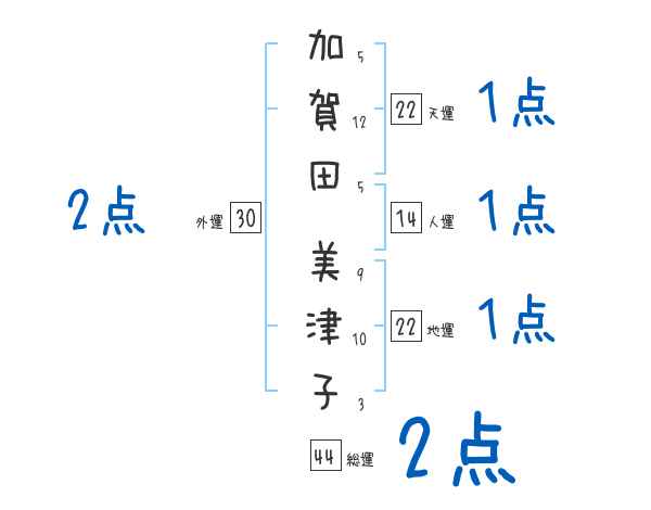 天運![]() | 加賀田美津子さんの天運は22画の1つ星!努力することが苦手ないっぽう手先が器用。芸術性にも優れる。 家系が持つ宿命的な運勢を表します。祖先から受け継いだ苗字ですので自分の力が及びません。家柄を象徴します。 |