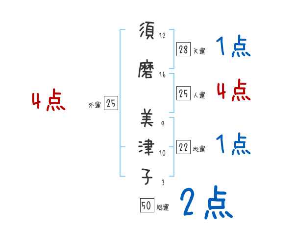 天運![]() | 須磨美津子さんの天運は28画の1つ星!家庭環境に注意。スポーツで活躍できる能力があるかも。 家系が持つ宿命的な運勢を表します。祖先から受け継いだ苗字ですので自分の力が及びません。家柄を象徴します。 |