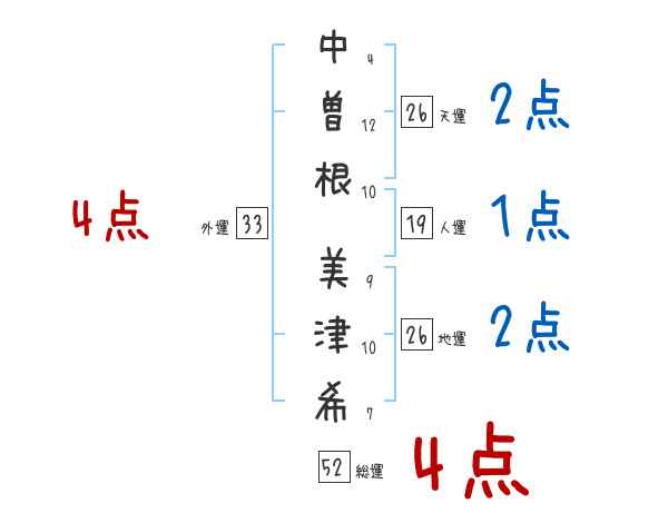 外運![]() | 中曽根美津希さんの外運は33画の4つ星!権力志向でプライドが高い。勇気があり運を切り開き成功する。 生活面を象徴する運勢です。外部から受ける影響力を表し、結婚運、家庭運や職場、環境への順応性を表します。 |