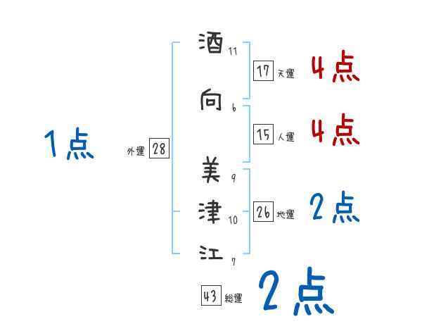 総運![]() | 酒向美津江さんの総運は43画の2つ星!頑固な性格で独立心が強いかも。やや非現実的で浪費に注意しましょう。 あなたの人生を表す1番重要な運勢です。生涯を通じて影響する総合運となり、主に50歳以降の晩年期に影響を及ぼします。 |
