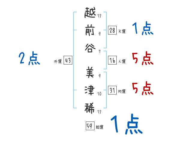 天運![]() | 越前谷美津稀さんの天運は28画の1つ星!家庭環境に注意。スポーツで活躍できる能力があるかも。 家系が持つ宿命的な運勢を表します。祖先から受け継いだ苗字ですので自分の力が及びません。家柄を象徴します。 |