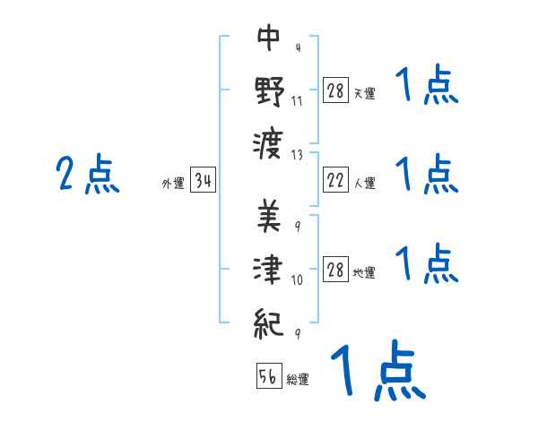 天運![]() | 中野渡美津紀さんの天運は28画の1つ星!家庭環境に注意。スポーツで活躍できる能力があるかも。 家系が持つ宿命的な運勢を表します。祖先から受け継いだ苗字ですので自分の力が及びません。家柄を象徴します。 |