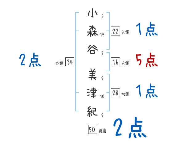 外運![]() | 小森谷美津紀さんの外運は34画の2つ星!独創性に優れるが、自尊心が強く災難に注意しましょう。 生活面を象徴する運勢です。外部から受ける影響力を表し、結婚運、家庭運や職場、環境への順応性を表します。 |