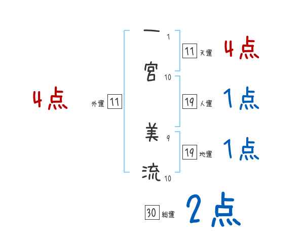 天運![]() | 一宮美流さんの天運は11画の4つ星!着実に富や地位を得る幸運な人生。 家系が持つ宿命的な運勢を表します。祖先から受け継いだ苗字ですので自分の力が及びません。家柄を象徴します。 |