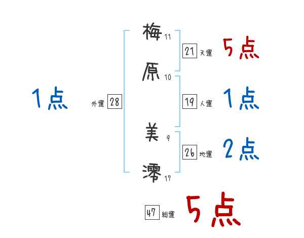 総運![]() | 梅原美澪さんの総運は47画の5つ星!実力が開花し発展する円満な人生。財に恵まれる。 あなたの人生を表す1番重要な運勢です。生涯を通じて影響する総合運となり、主に50歳以降の晩年期に影響を及ぼします。 |