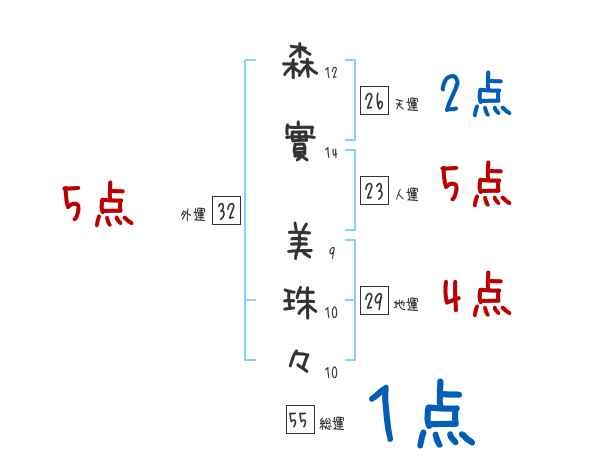 外運![]() | 森實美珠々さんの外運は32画の5つ星!柔軟性があり成功する。チャンスが多く金運が良い。 生活面を象徴する運勢です。外部から受ける影響力を表し、結婚運、家庭運や職場、環境への順応性を表します。 |