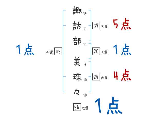 総運![]() | 諏訪部美珠々さんの総運は66画の1つ星!迷うことが多く挫折しやすい傾向が。辛抱強く物事に取り組みましょう。 あなたの人生を表す1番重要な運勢です。生涯を通じて影響する総合運となり、主に50歳以降の晩年期に影響を及ぼします。 |