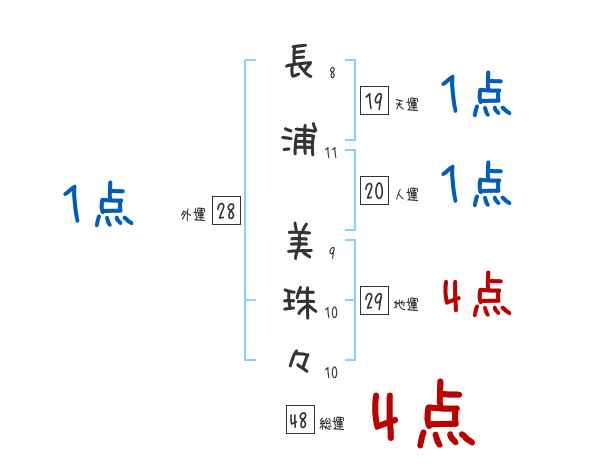 天運![]() | 長浦美珠々さんの天運は19画の1つ星!優れた才能を持ちますが、協調性が足りないことも。周りの人と協力する事を意識しましょう。 家系が持つ宿命的な運勢を表します。祖先から受け継いだ苗字ですので自分の力が及びません。家柄を象徴します。 |