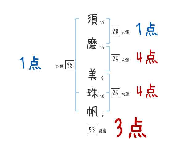 天運![]() | 須磨美珠帆さんの天運は28画の1つ星!家庭環境に注意。スポーツで活躍できる能力があるかも。 家系が持つ宿命的な運勢を表します。祖先から受け継いだ苗字ですので自分の力が及びません。家柄を象徴します。 |