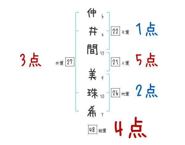 外運![]() | 仲井間美珠希さんの外運は27画の3つ星!頭脳明晰だが強情で摩擦が多い傾向。孤立に注意。 生活面を象徴する運勢です。外部から受ける影響力を表し、結婚運、家庭運や職場、環境への順応性を表します。 |