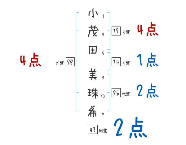 総運![]() | 小茂田美珠希さんの総運は43画の2つ星!頑固な性格で独立心が強いかも。やや非現実的で浪費に注意しましょう。 あなたの人生を表す1番重要な運勢です。生涯を通じて影響する総合運となり、主に50歳以降の晩年期に影響を及ぼします。 |