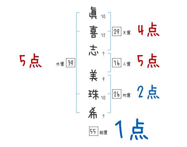 天運![]() | 眞喜志美珠希さんの天運は29画の4つ星!完全主義で才能がある。厳格な心の持ち主。 家系が持つ宿命的な運勢を表します。祖先から受け継いだ苗字ですので自分の力が及びません。家柄を象徴します。 |