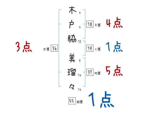 天運![]() | 木戸脇美瑠々さんの天運は18画の4つ星!情熱的で剛気。忍耐力があり信頼される。 家系が持つ宿命的な運勢を表します。祖先から受け継いだ苗字ですので自分の力が及びません。家柄を象徴します。 |