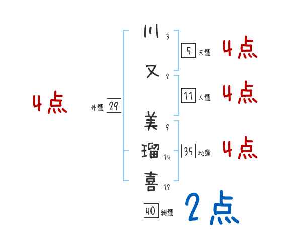外運![]() | 川又美瑠喜さんの外運は29画の4つ星!完全主義で才能がある。厳格な心の持ち主。 生活面を象徴する運勢です。外部から受ける影響力を表し、結婚運、家庭運や職場、環境への順応性を表します。 |