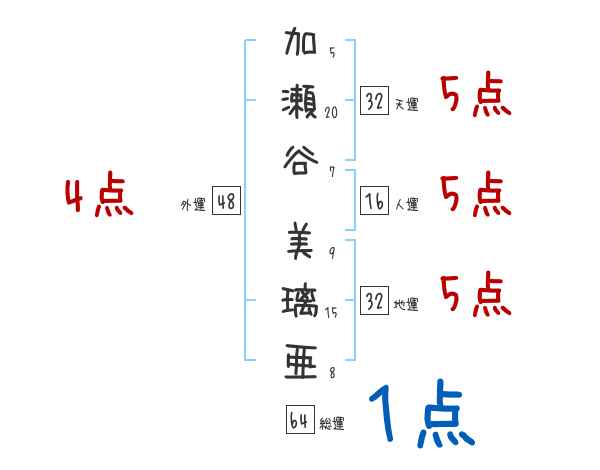 天運![]() | 加瀬谷美璃亜さんの天運は32画の5つ星!柔軟性があり成功する。チャンスが多く金運が良い。 家系が持つ宿命的な運勢を表します。祖先から受け継いだ苗字ですので自分の力が及びません。家柄を象徴します。 |