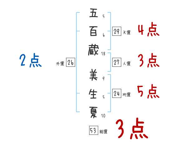 総運![]() | 五百蔵美生夏さんの総運は53画の3つ星!やや見栄っ張りで虚栄心がある。散財に注意。 あなたの人生を表す1番重要な運勢です。生涯を通じて影響する総合運となり、主に50歳以降の晩年期に影響を及ぼします。 |