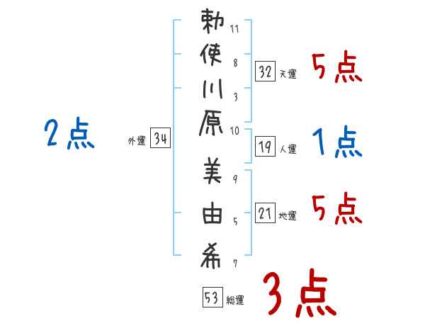 天運![]() | 勅使川原美由希さんの天運は32画の5つ星!柔軟性があり成功する。チャンスが多く金運が良い。 家系が持つ宿命的な運勢を表します。祖先から受け継いだ苗字ですので自分の力が及びません。家柄を象徴します。 |
