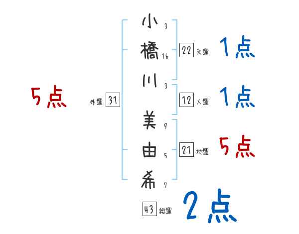 天運![]() | 小橋川美由希さんの天運は22画の1つ星!努力することが苦手ないっぽう手先が器用。芸術性にも優れる。 家系が持つ宿命的な運勢を表します。祖先から受け継いだ苗字ですので自分の力が及びません。家柄を象徴します。 |