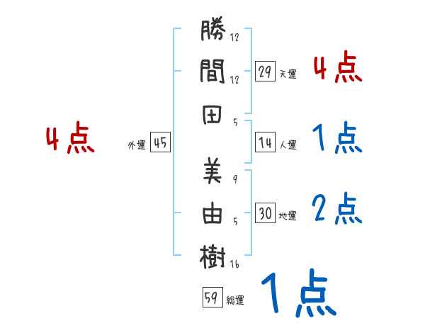 外運![]() | 勝間田美由樹さんの外運は45画の4つ星!もくもくと物事を進め達成する。地味な努力家。 生活面を象徴する運勢です。外部から受ける影響力を表し、結婚運、家庭運や職場、環境への順応性を表します。 |