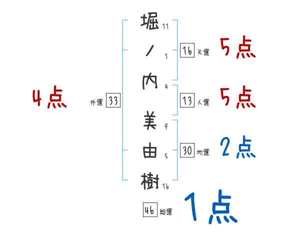 外運![]() | 堀ノ内美由樹さんの外運は33画の4つ星!権力志向でプライドが高い。勇気があり運を切り開き成功する。 生活面を象徴する運勢です。外部から受ける影響力を表し、結婚運、家庭運や職場、環境への順応性を表します。 |