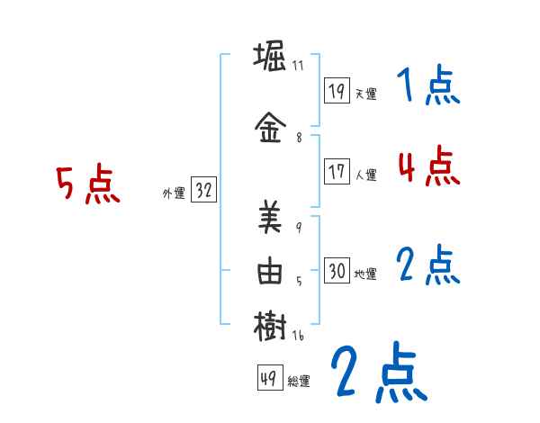 外運![]() | 堀金美由樹さんの外運は32画の5つ星!柔軟性があり成功する。チャンスが多く金運が良い。 生活面を象徴する運勢です。外部から受ける影響力を表し、結婚運、家庭運や職場、環境への順応性を表します。 |