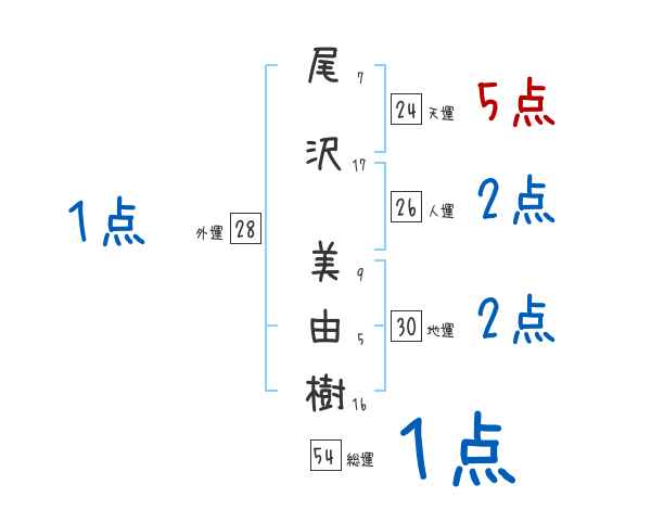 天運![]() | 尾沢美由樹さんの天運は24画の5つ星!家庭運が良く順調な人生。金運にも恵まれる。 家系が持つ宿命的な運勢を表します。祖先から受け継いだ苗字ですので自分の力が及びません。家柄を象徴します。 |