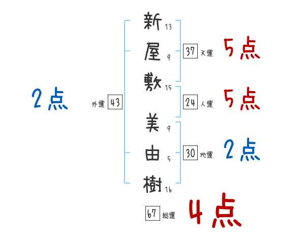 人運![]() | 新屋敷美由樹さんの人運は24画の5つ星!家庭運が良く順調な人生。金運にも恵まれる。 性格や才能などを表す2番目に重要な運勢です。人間関係や協調性、社会的な成功に影響します。主に20歳から50歳ぐらいまでの中年期の運勢を表します。 |