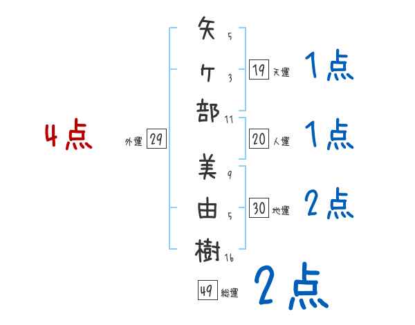 外運![]() | 矢ヶ部美由樹さんの外運は29画の4つ星!完全主義で才能がある。厳格な心の持ち主。 生活面を象徴する運勢です。外部から受ける影響力を表し、結婚運、家庭運や職場、環境への順応性を表します。 |