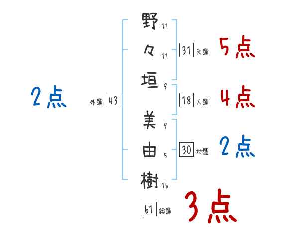総運![]() | 野々垣美由樹さんの総運は61画の3つ星!強情な性格でうぬぼれタイプ。自ら破滅する。 あなたの人生を表す1番重要な運勢です。生涯を通じて影響する総合運となり、主に50歳以降の晩年期に影響を及ぼします。 |