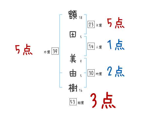 外運![]() | 額田美由樹さんの外運は39画の5つ星!社交性に優れ人望が厚い。人の上に立ち成功する。 生活面を象徴する運勢です。外部から受ける影響力を表し、結婚運、家庭運や職場、環境への順応性を表します。 |