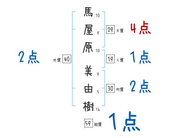 天運![]() | 馬屋原美由樹さんの天運は29画の4つ星!完全主義で才能がある。厳格な心の持ち主。 家系が持つ宿命的な運勢を表します。祖先から受け継いだ苗字ですので自分の力が及びません。家柄を象徴します。 |