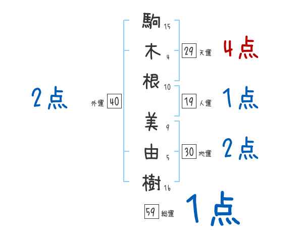 天運![]() | 駒木根美由樹さんの天運は29画の4つ星!完全主義で才能がある。厳格な心の持ち主。 家系が持つ宿命的な運勢を表します。祖先から受け継いだ苗字ですので自分の力が及びません。家柄を象徴します。 |