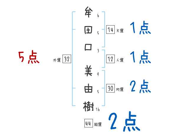 外運![]() | 牟田口美由樹さんの外運は32画の5つ星!柔軟性があり成功する。チャンスが多く金運が良い。 生活面を象徴する運勢です。外部から受ける影響力を表し、結婚運、家庭運や職場、環境への順応性を表します。 |