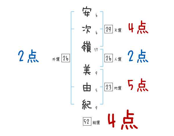 外運![]() | 安次嶺美由紀さんの外運は26画の2つ星!波瀾万丈かも。信頼できる人を大事にしましょう。 生活面を象徴する運勢です。外部から受ける影響力を表し、結婚運、家庭運や職場、環境への順応性を表します。 |